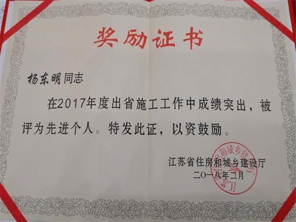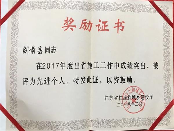 青島分公司、青海分公司被江蘇省住房和城鄉(xiāng)建設(shè)廳評(píng)為2017年度出省建筑施工先進(jìn)集體。青島分公司經(jīng)理?xiàng)顤|明同志、青海分公司劉前昌同志被江蘇省住房和城鄉(xiāng)建設(shè)廳評(píng)為2017年度出省施工先進(jìn)個(gè)人。